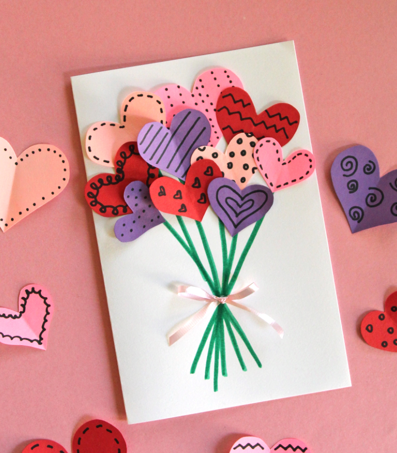 The best gift you can give to someone on a holiday or on their birthday is a handmade card! Creating a bouquet of hearts card for Valentine’s Day is easy and fun if you have a stack of colored paper, markers, and glue on hand.